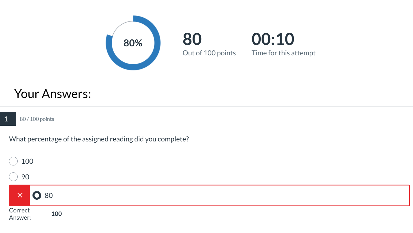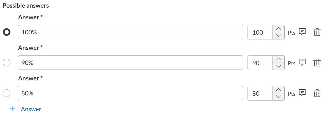 Now, when students take the quiz, they only need to select the appropriate percentage, and the quiz will be automatically graded accordingly: